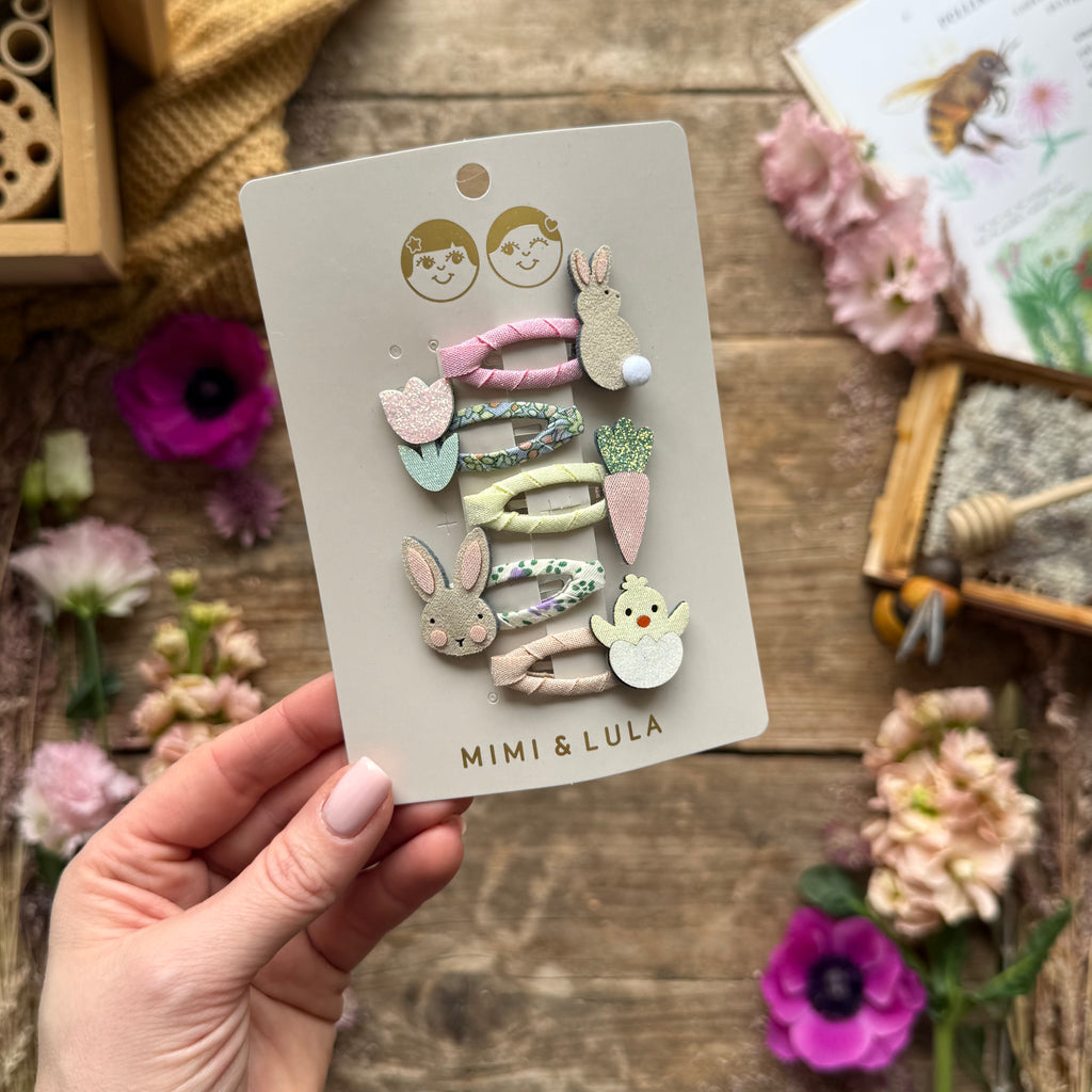 Decorate their 'do with this adorable five pack of mini clic clacs! Featuring two bunnies, a cute hatching chick, carrot and sweet tulip - it's the perfect pack for little ones with finer hair.