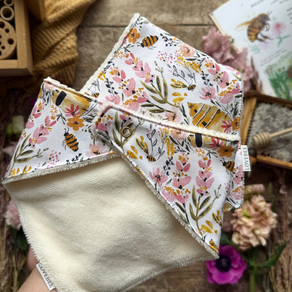 Made from the softest printed organic cotton and backed in soft white bamboo towelling, LoveBee's dribble bibs are functional, hypoallergenic, and keep your little one dry.