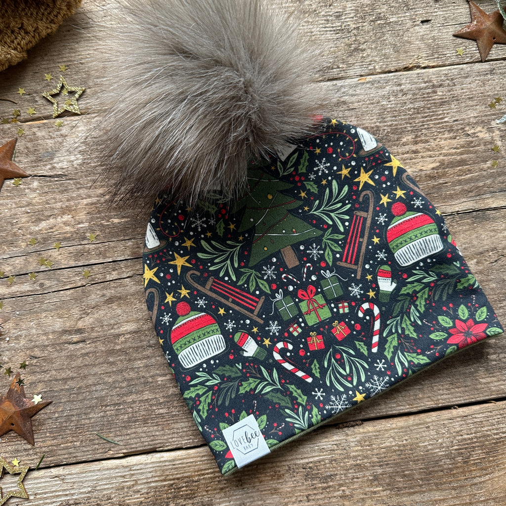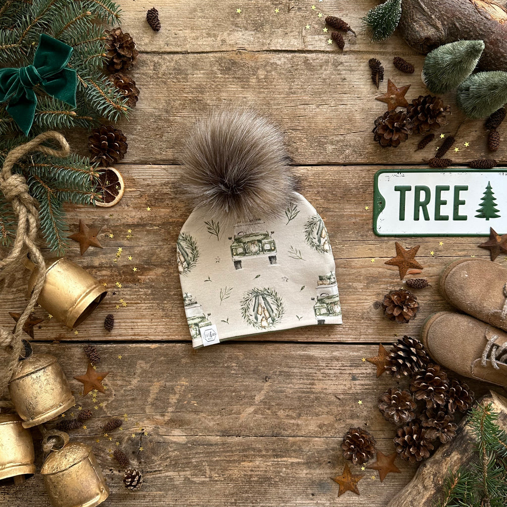 Hats are finished with a handmade 100% faux fur pom pom with wooden toggle.