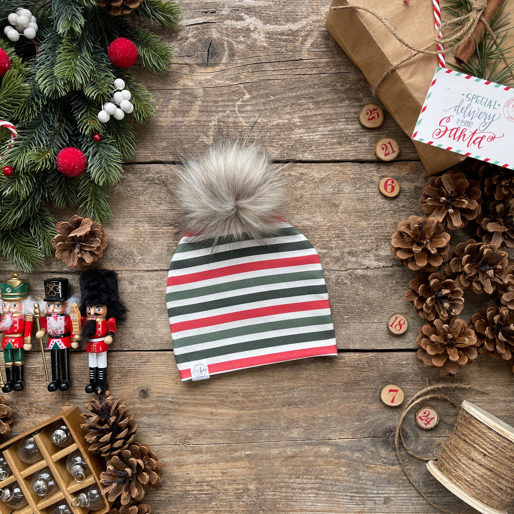Hats are finished with a handmade 100% faux fur pom pom with wooden toggle.