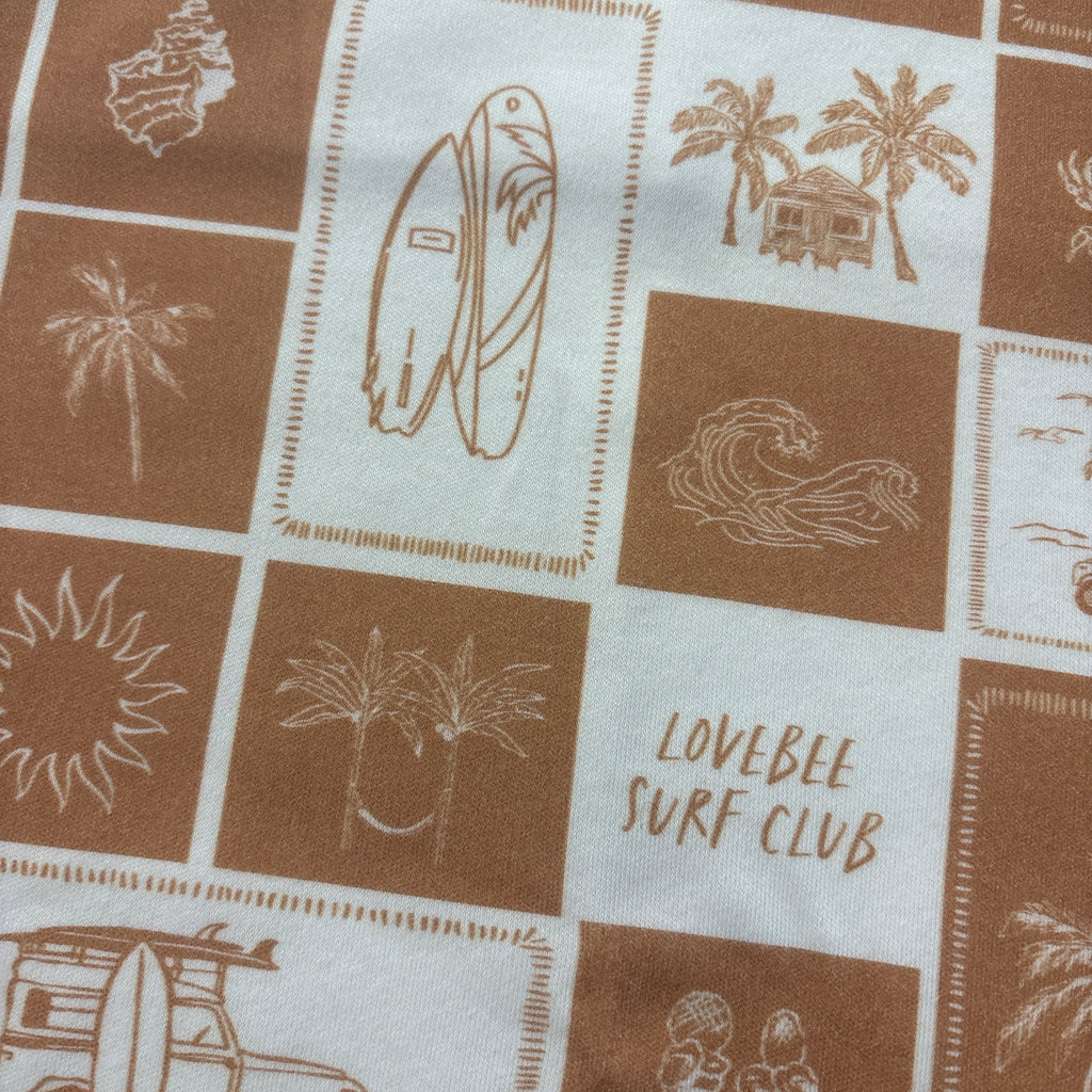 Main body - 100% organic cotton fabric with interlock knit, printed with Ultra-color technology for vibrant colour and improved wash durability. Cuffs - 95% organic cotton, 5% elastane. Both certified organic cotton by Global Organic Textile Standards (GOTS).