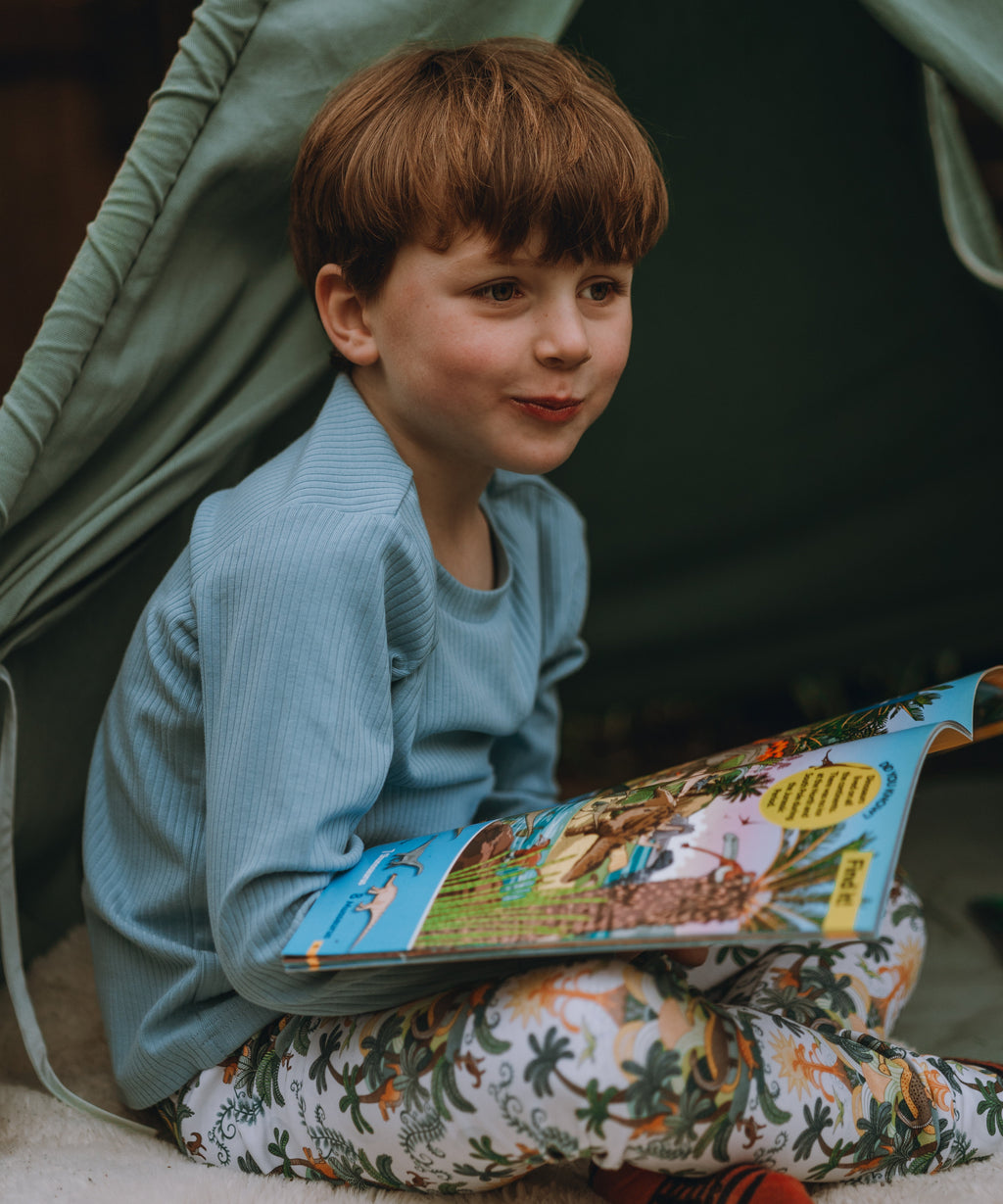 Main body - 100% organic cotton fabric with interlock knit, printed with Ultra-color technology for vibrant colour and improved wash durability. Cuffs - 95% organic cotton, 5% elastane. Both certified organic cotton by Global Organic Textile Standards (GOTS).