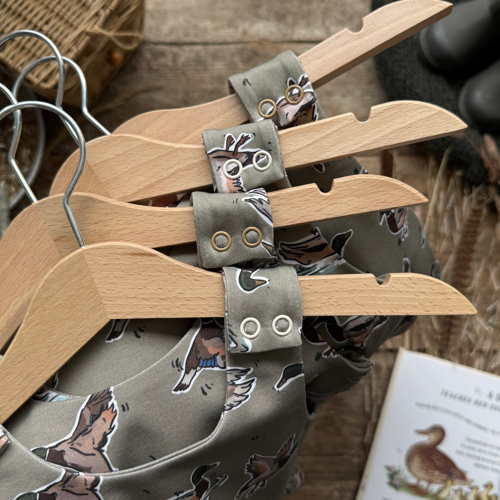 Rompers, Dresses and bibs are fastened with a metal popper. The poppers I use are made with environmentally friendly paint, quality is much better than general. Snap them together to wash as they can get stuck in the drum.