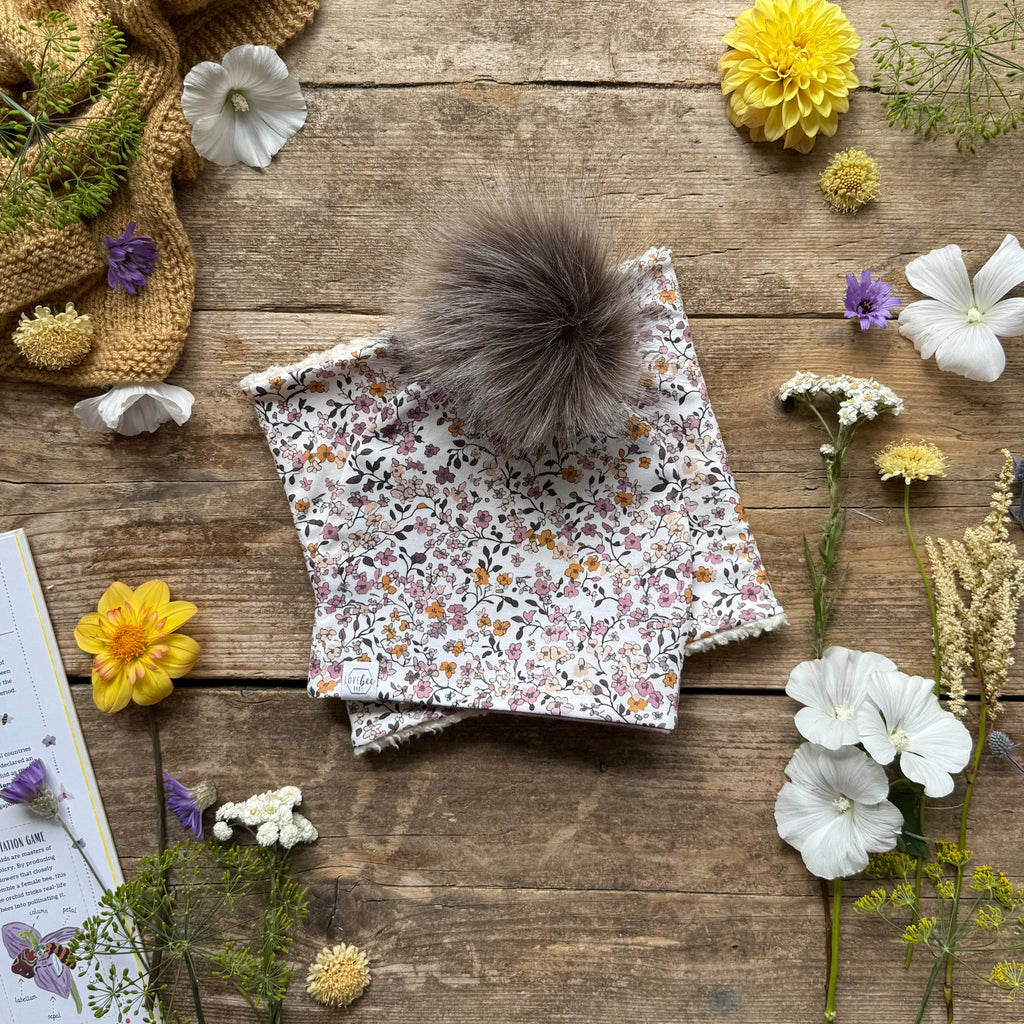Hats are finished with a handmade 100% faux fur pom pom with wooden toggle.