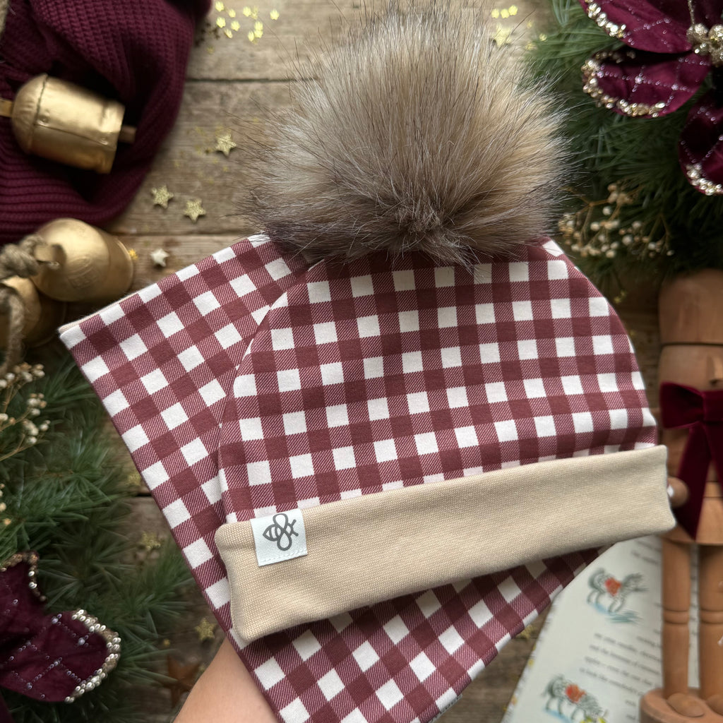 Hats are finished with a handmade 100% faux fur pom pom with wooden toggle.