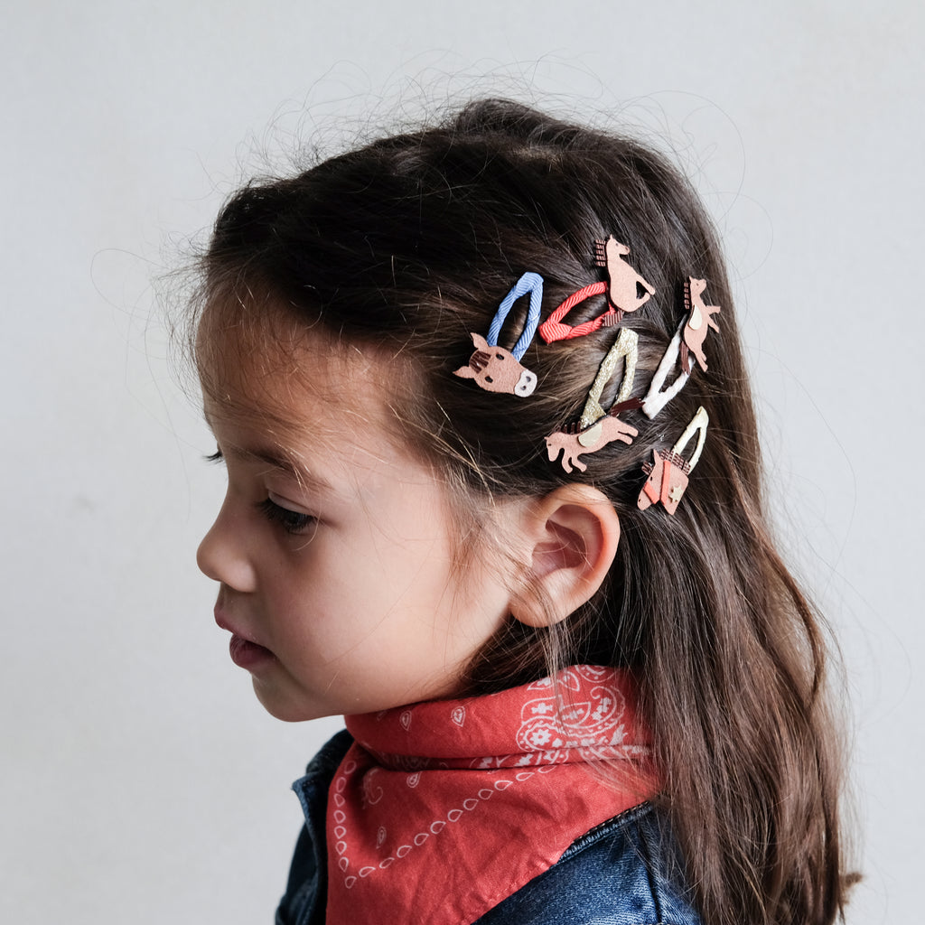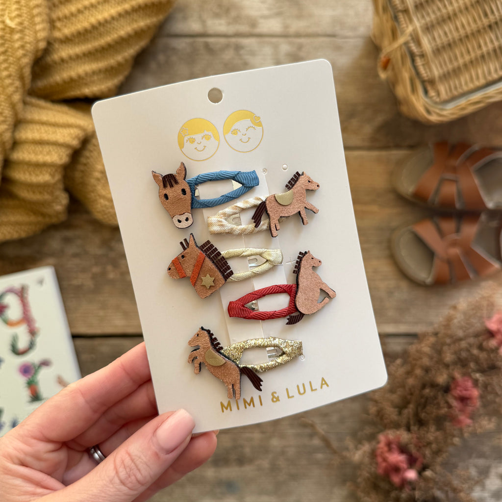 Saddle up in style with this fabulously fun pack of Pony mini clips featuring five little foals in a selection of playful stances! 5 in a pack Clic clac clips wrapped in a mix of glitter, grosgrain, gold and checked fabrics Ponies crafted from a mix of soft suedette and gold metallic fabrics with grosgrain ribbon tails and manes