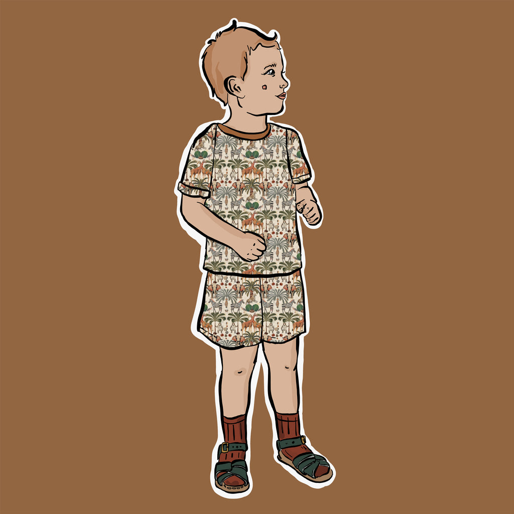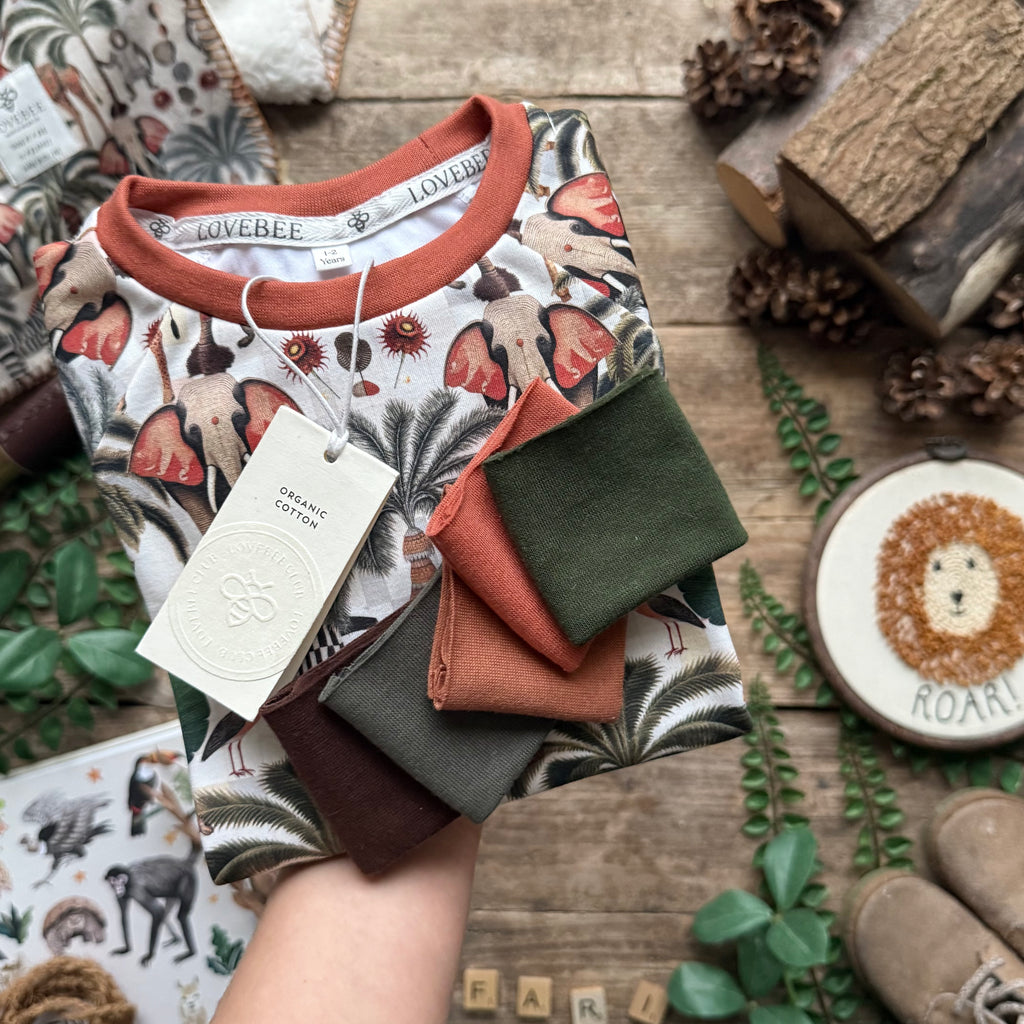 Main body - 100% organic cotton fabric with interlock knit, printed with Ultra-color technology for vibrant colour and improved wash durability. Cuffs - 95% organic cotton, 5% elastane. Both certified organic cotton by Global Organic Textile Standards (GOTS).