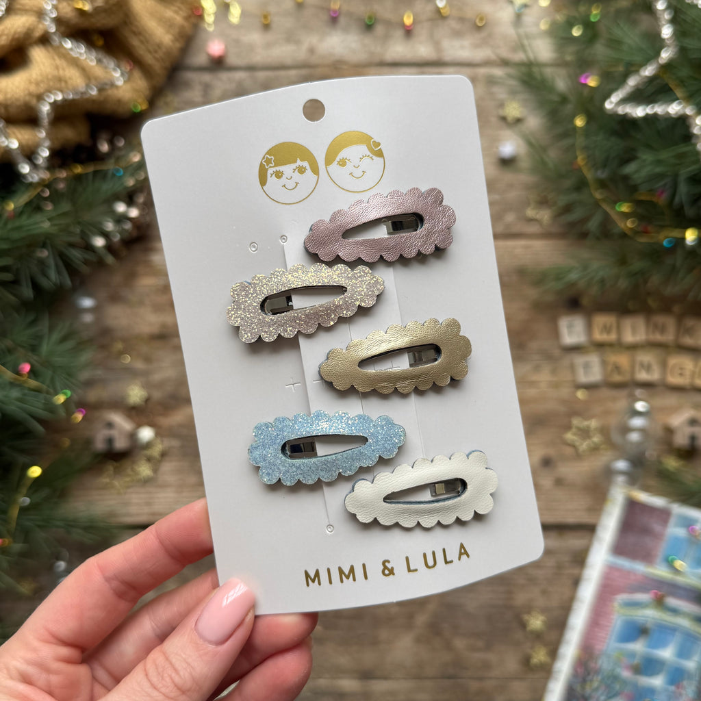 5 in a pack Crafted from a mix of shimmering metallic and glitter fabrics in a soft, neutral colour palette Approx 4cm clic clac clips