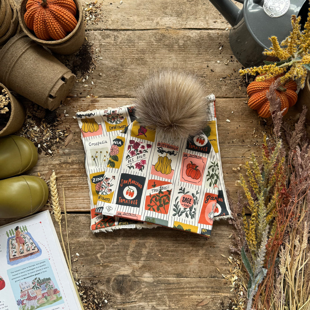 Hats are finished with a handmade 100% faux fur pom pom with wooden toggle.