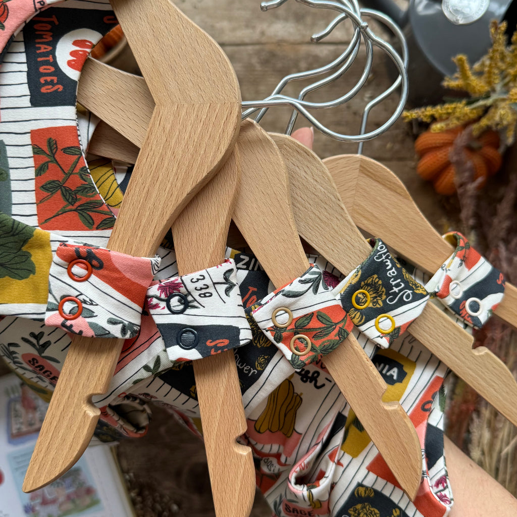 Rompers, Dresses and bibs are fastened with a metal popper. The poppers I use are made with environmentally friendly paint, quality is much better than general. Snap them together to wash as they can get stuck in the drum.
