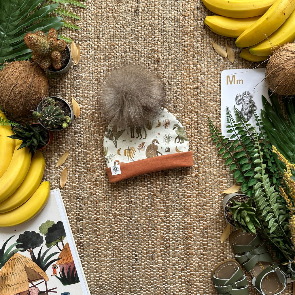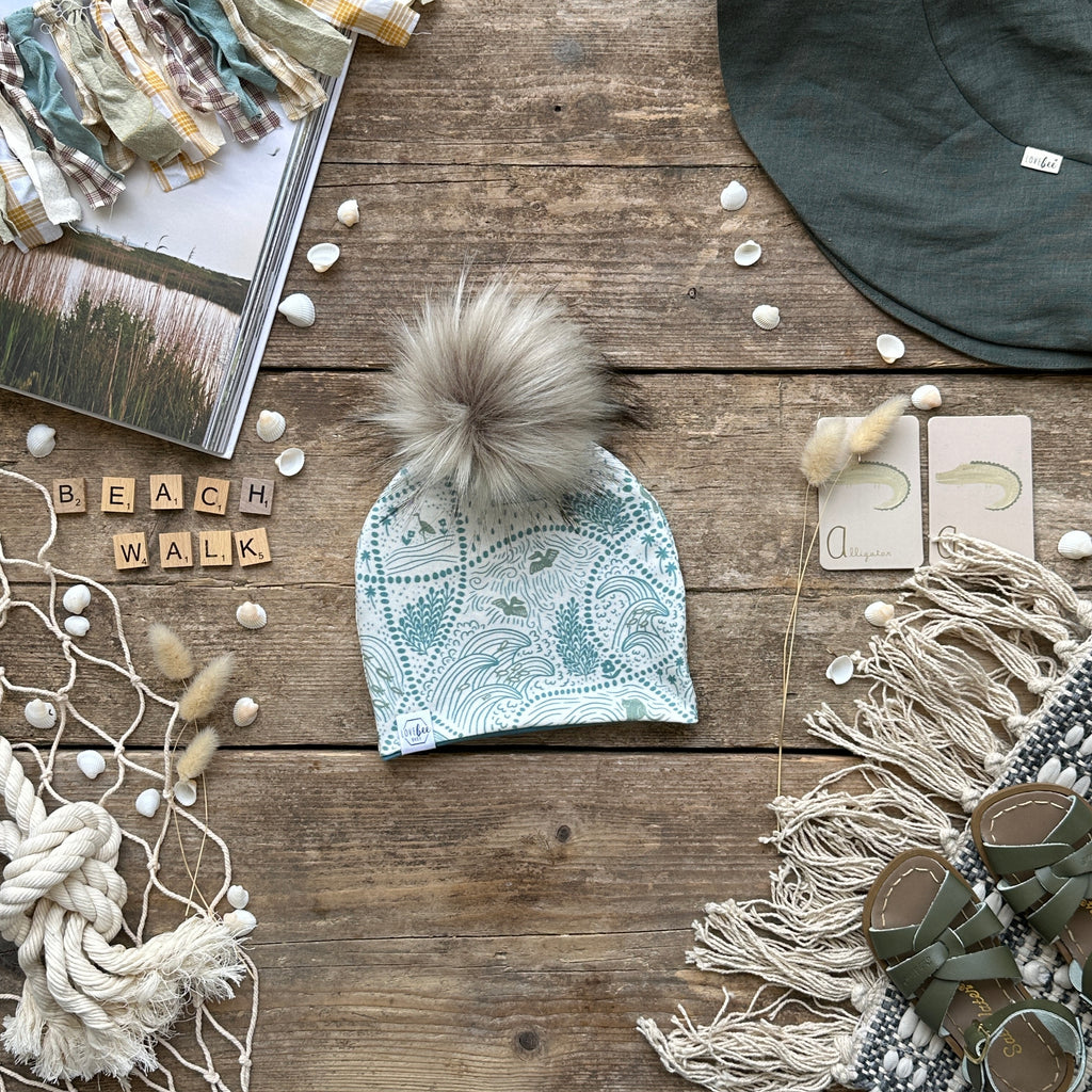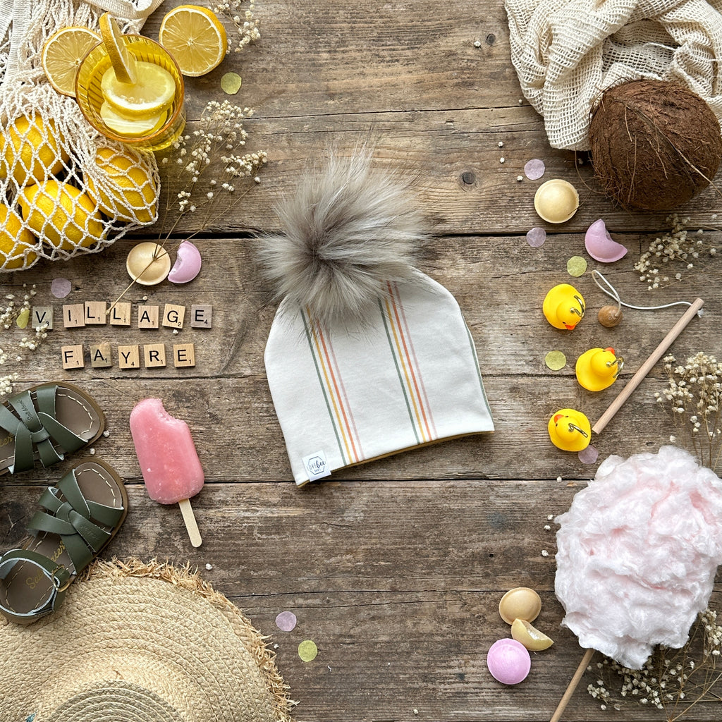 Hats are finished with a handmade 100% faux fur pom pom with wooden toggle.