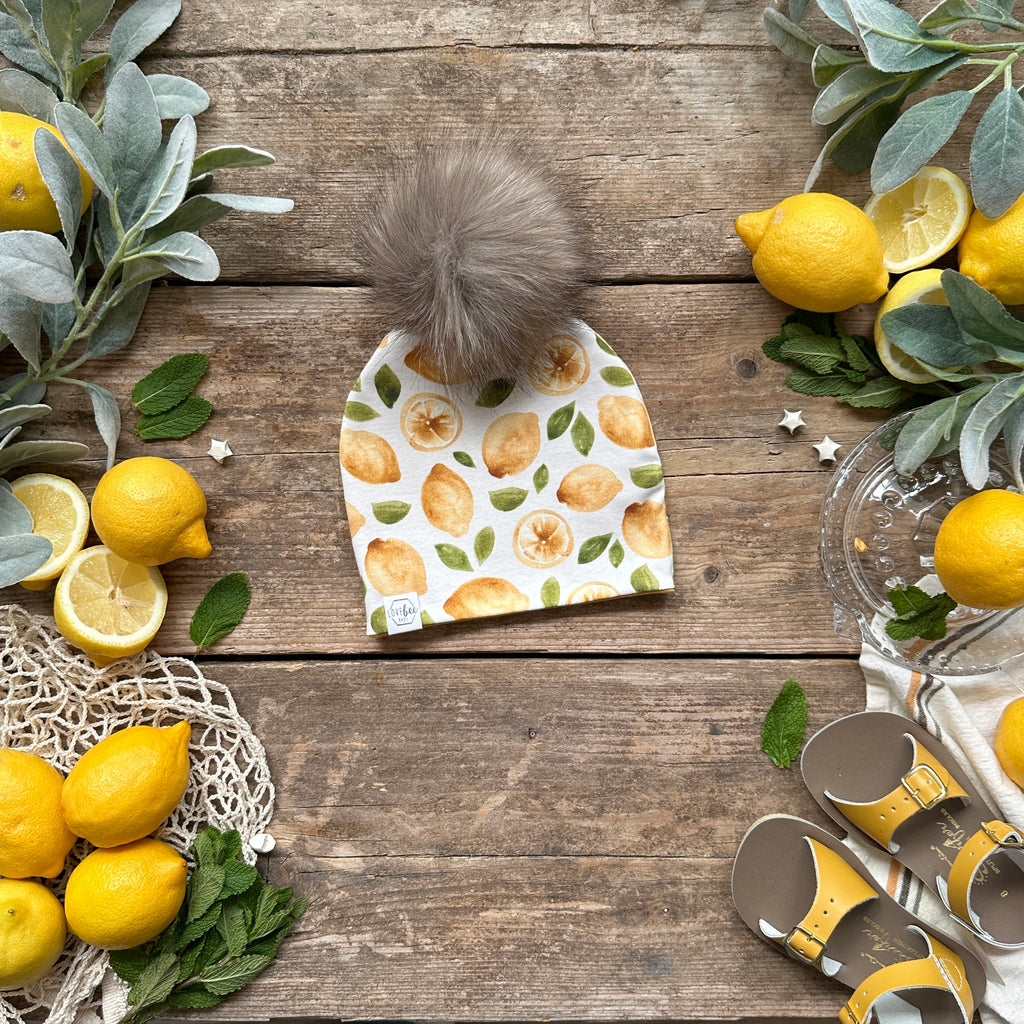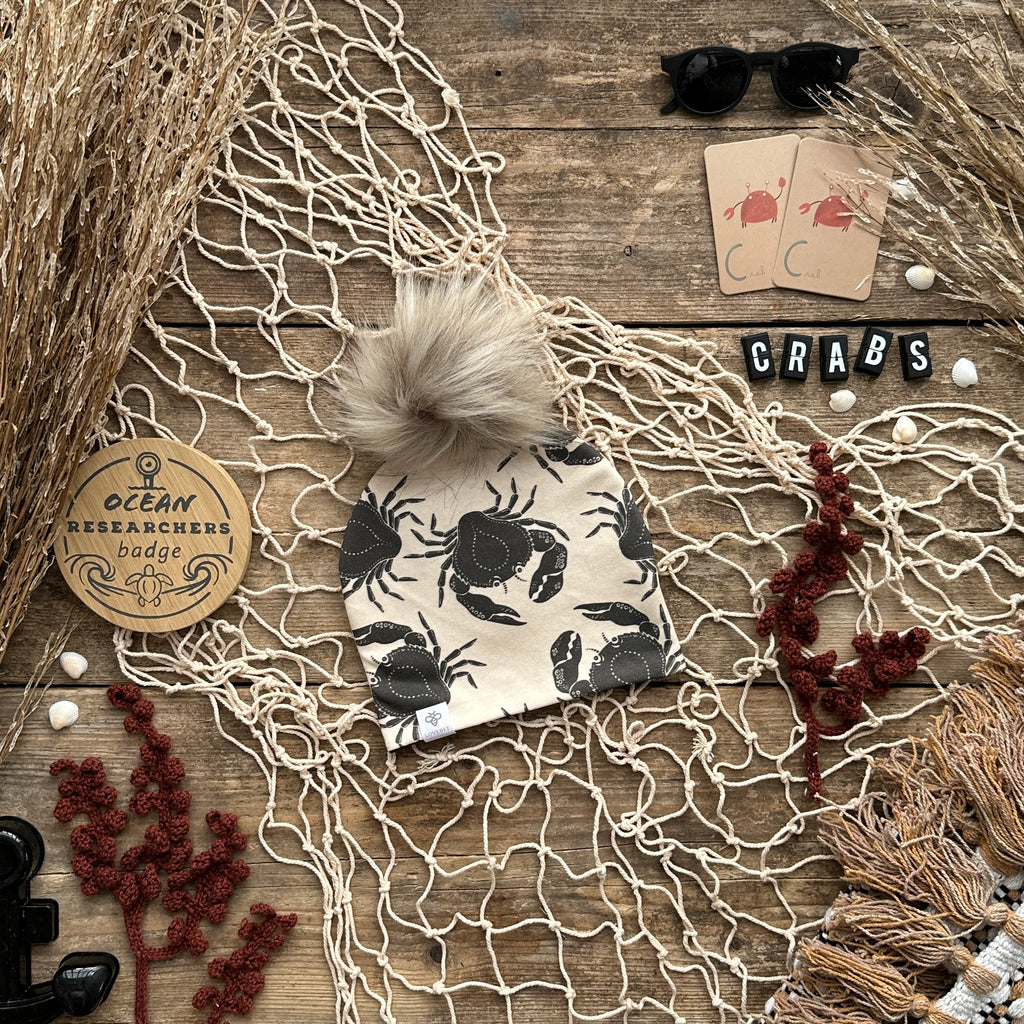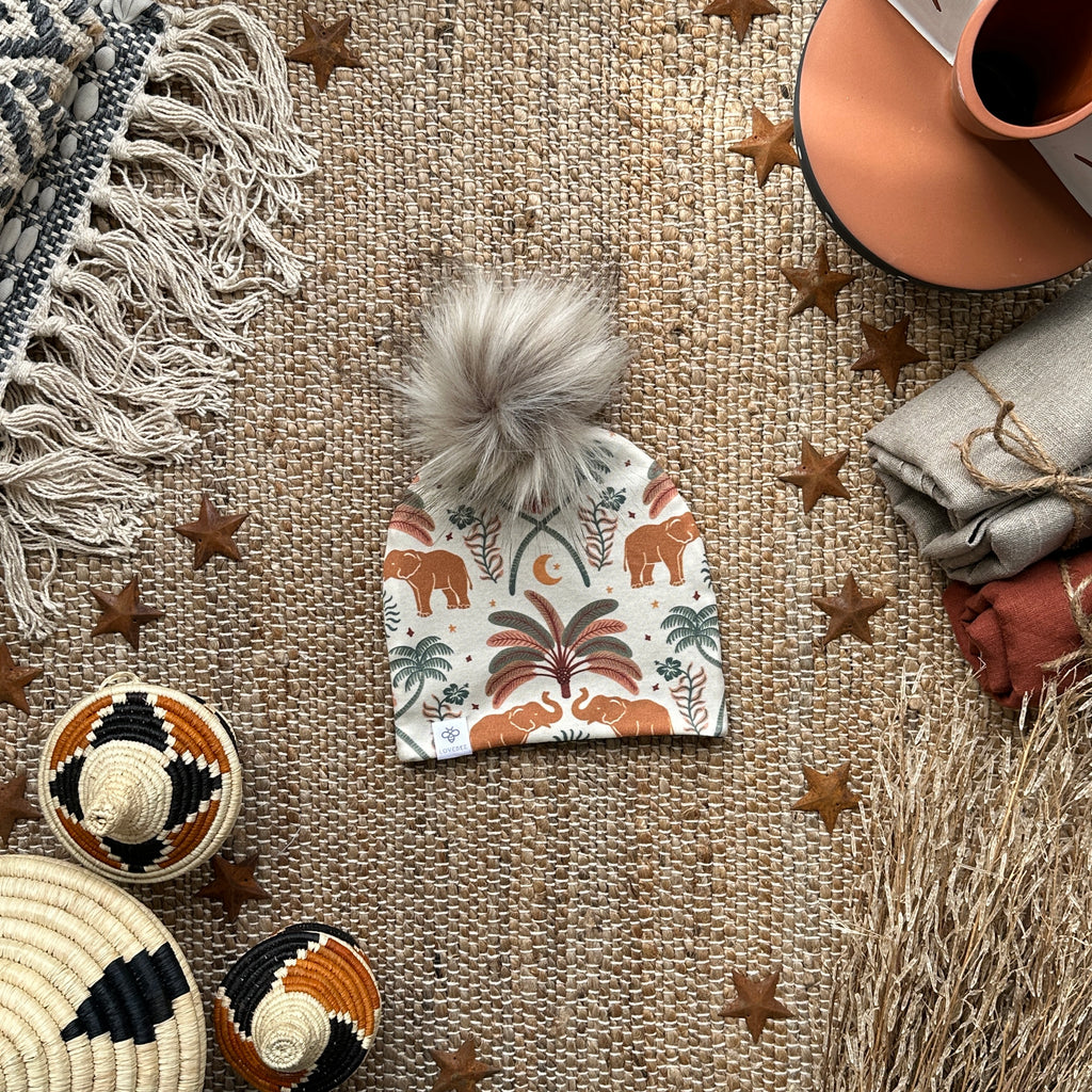 Hats are finished with a handmade 100% faux fur pom pom with wooden toggle.