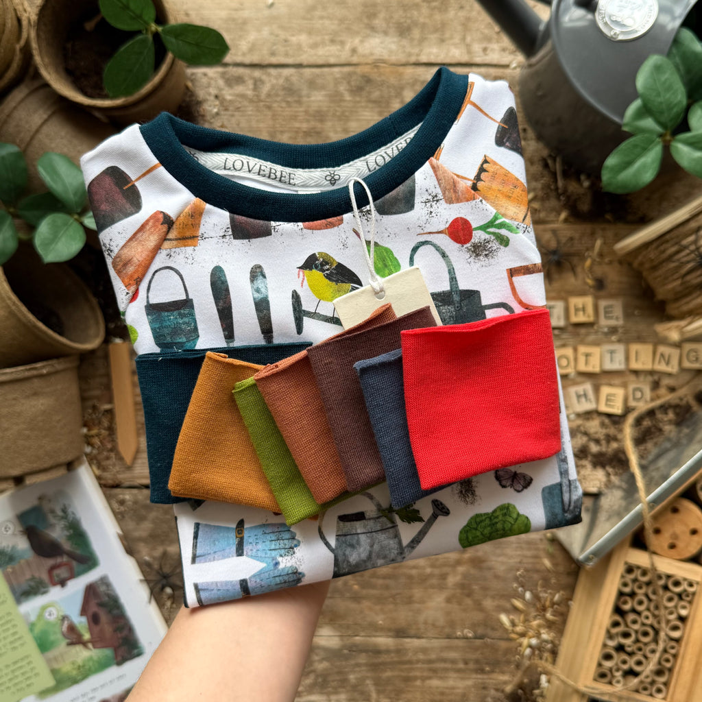 Main body - 100% organic cotton fabric with interlock knit, printed with Ultra-color technology for vibrant colour and improved wash durability. Cuffs - 95% organic cotton, 5% elastane. Both certified organic cotton by Global Organic Textile Standards (GOTS).