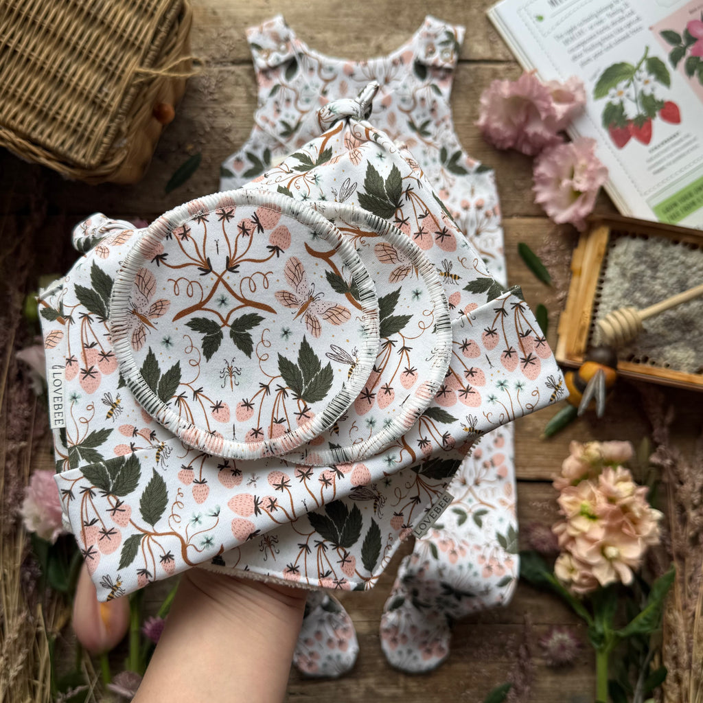 Dribble bibs and boo-bee pads are backed in a Bamboo. Bamboo is sustainable and has so many benefits including being Hypoallergenic, Thermo-Control and its Anti-Bacterial properties. Bamboo has the unique ability to sweep dribble away from the skin, then evaporating it through the garments surface, keeping your little one dry and those boo bees from leaking.