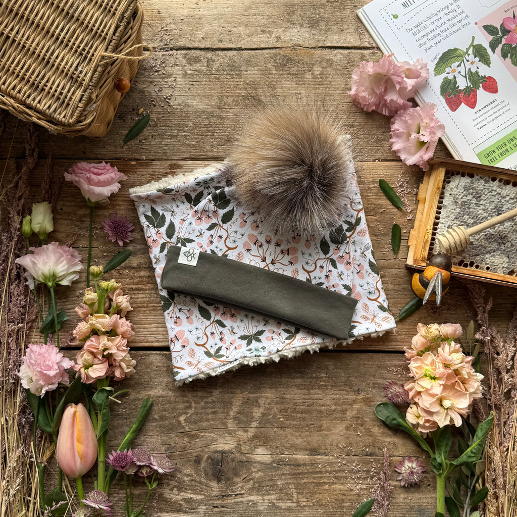 Hats are finished with a handmade 100% faux fur pom pom with wooden toggle.