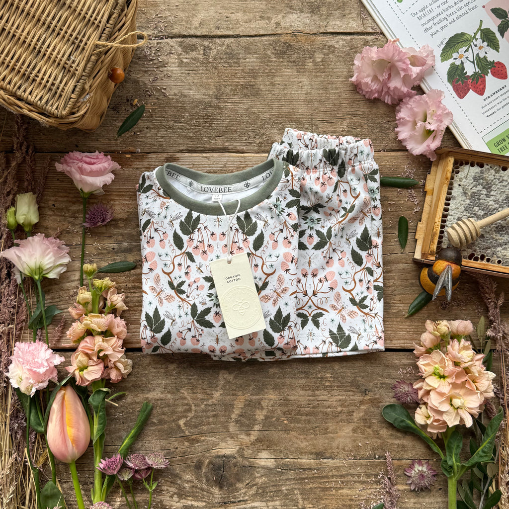 Main body - 100% organic cotton fabric with interlock knit, printed with Ultra-color technology for vibrant colour and improved wash durability. Cuffs - 95% organic cotton, 5% elastane. Both certified organic cotton by Global Organic Textile Standards (GOTS).