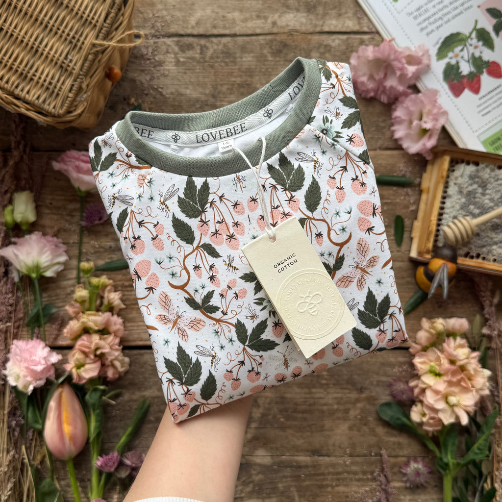 Main body - 100% organic cotton fabric with interlock knit, printed with Ultra-color technology for vibrant colour and improved wash durability. Cuffs - 95% organic cotton, 5% elastane. Both certified organic cotton by Global Organic Textile Standards (GOTS).