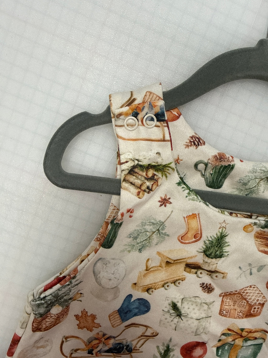 Rompers, Dresses and bibs are fastened with a metal popper. The poppers I use are made with environmentally friendly paint, quality is much better than general. Snap them together to wash as they can get stuck in the drum.